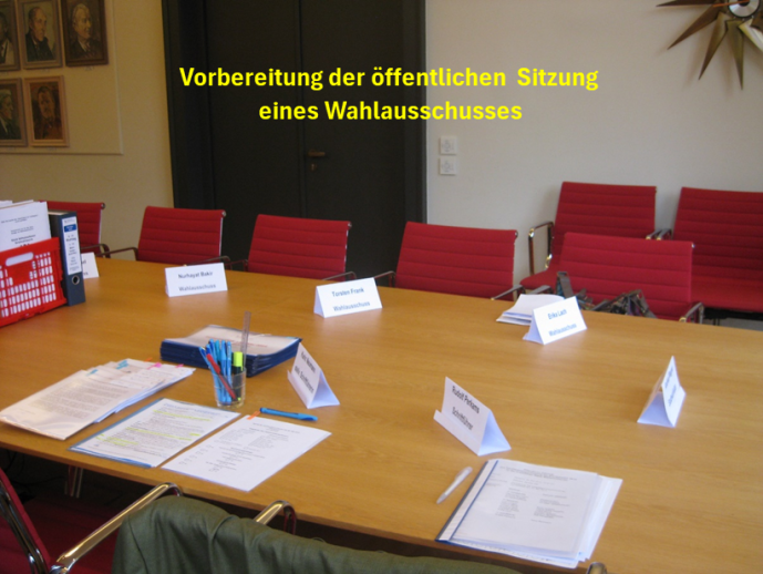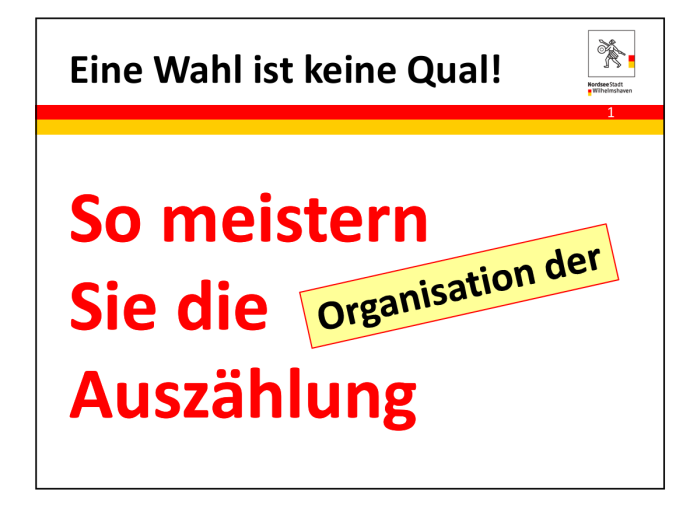 In einem in Hannover gehaltenen öffentlichen Vortrag vor vielen Wahlleitungen schilderte Rudolf Perkams als jahrzehntelanger Leiter des Wilhelmshavener Wahlamtes in einer PowerPoint-Präsentation die Organisation einer Auszählung zum Beispiel für eine Bundestagswahl (... klicken Sie für die pdf-Datei auf das Vorschaubild).